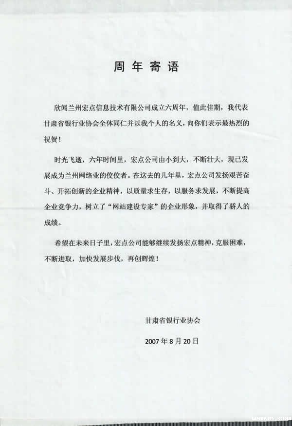 欣闻兰州伟德信任平台信息技术有限公司成立六周年,值此佳期,我代表甘肃省银行业协会全体同仁并以我个人的名义,向你们表示最热烈的祝贺!