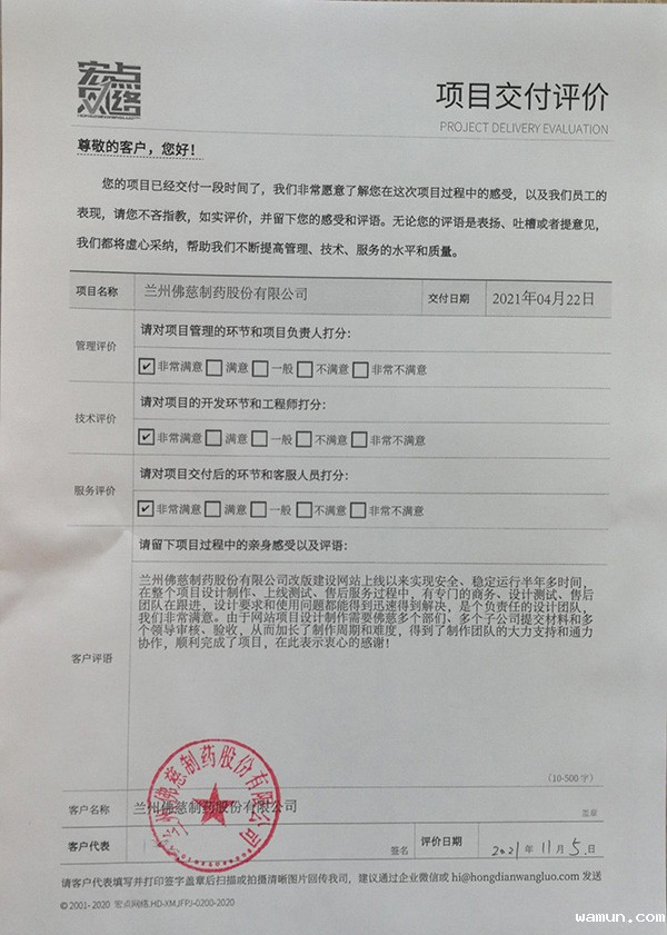 兰州佛慈制药股份有限公司改版建设网站上线以来实现安全、稳定运行半年多时间,在整个项目设计制作,上线测试,售后服务过程中,有专门的商务、设计测试、售后团队在跟进,设计要求和使用问题都能得到迅速的解决,是个负责任的设计团队,我们非常满意。由于网站项目设计制作需要佛慈多个部门,多个子公司提交材料和多个领导审核,验收,从而加长了制作周期和难度,得到了制作团队的大力支持和通力协作,顺利完成了项目,在此表示衷心的感谢!
